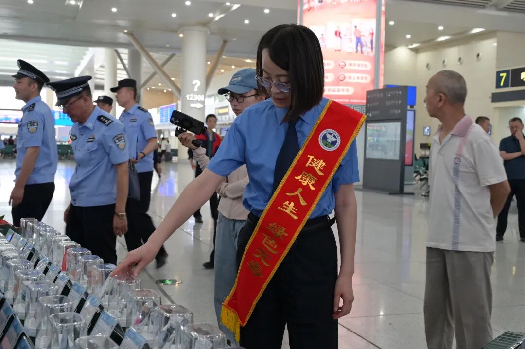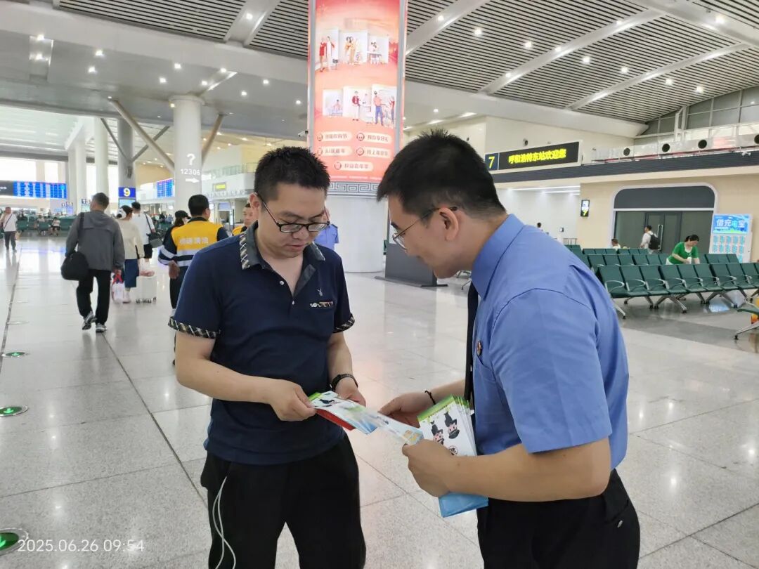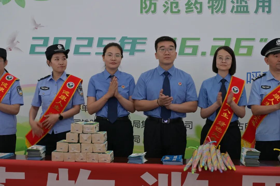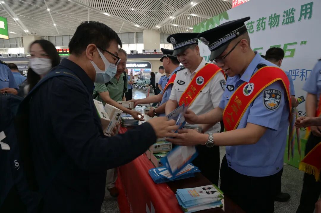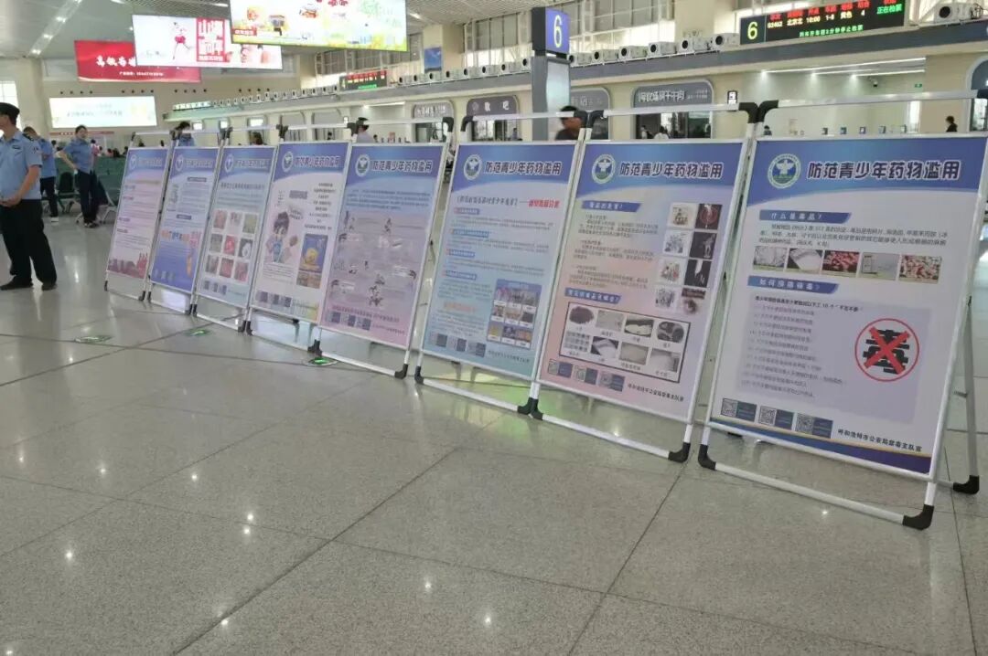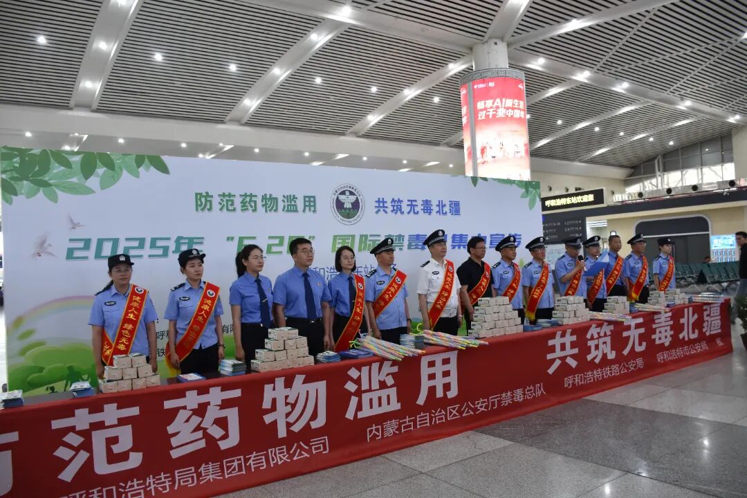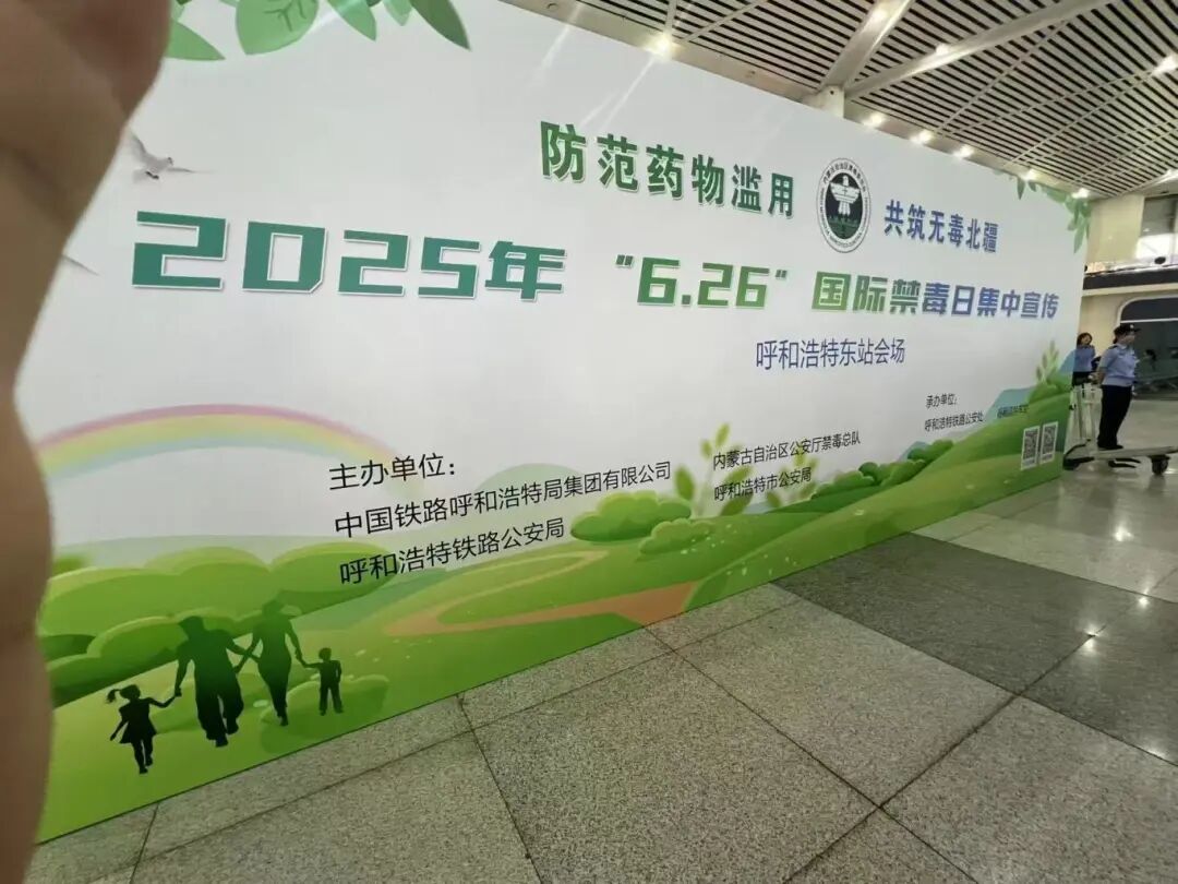 为深入推进禁毒预防教育,提升人民群众识毒、防毒、拒毒意识和能力,共同构筑绿色无毒的北疆防线,2025年6月26日上午,在呼和浩特火车站,呼和铁检院与中国铁路呼和浩特局集团有限公司、内蒙古自治区公安厅禁毒总队、呼和浩特铁路公安局、呼和浩特市公安局5家单位联合组成宣讲团举办“防范药物滥用 共筑无毒北疆”2025年“6.26国际禁毒日”集中宣传活动。