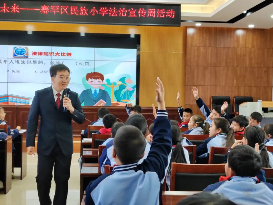 “这题我会!” “这道题选D。” “这样做是不对的,违反了…” 在赛罕区民族小学的法治课堂上,一场别开生面的“法律知识大比拼”正在如火如荼地上演,同学们一个个把手举地高高的,争先恐后地回答检察官孙楷为抛出的一个个问题,整个课堂氛围轻松有趣。课堂通过“案例分析解答”、法律常识问答方式展开“有奖问答”互动,确保法律知识入心入脑,同学们也不负众望的交上了一份满意的答卷,并收获了心仪的奖品——一本迷你版“手掌宪法”,孩子们们拿到这个“掌中宝”开心不已,互相传看。