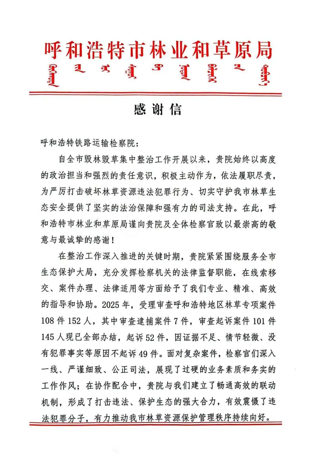 “面对复杂案件,检察官深入一线、严谨细致、公正司法,展现了过硬的业务素质和务实的工作作风......贵院的鼎力支持,不仅是对我们林草工作的有力促进,更是对‘绿水青山就是金山银山’理念的生动践行,彰显了检察机关守护北疆生态安全屏障的坚定决心和使命担当。”淡墨素笺,纸短情长,一封初冬寄来的感谢信,温暖了检察官的心。一纸感谢共初心,青山绿水映山河。来自行政机关的赞扬和鼓励,来自共同事业路上的肯定和感谢,是检察机关和林草部门生态守护路上的携手与共,是彼此双向奔赴共护北疆青绿的初心共勉。2025年12月8日,呼和铁检院收到一封来自呼市林业和草原局的感谢信,高度肯定我院在呼市生态环境司法保护,特别是毁林毁草违规违法行为集中整治工作中的突出贡献和在打击破坏林草资源违法犯罪中的履职尽责,并表达了进一步深化协作、共同筑牢北方生态安全屏障的坚定决心。字里行间满含对呼和铁检院在环资案件办理工作中鼎力支持的诚挚谢意,生动诠释了检政联动守护绿水青山的责任担当。 自2024年环资类案件集中管辖改革以来,呼和铁检院始终立足检察职能,聚焦生态环境保护重点领域,与呼市林业和草原局紧密协作、同向发力,成功办理了多起破坏林草资源、盗伐林木、危害野生动植物等案件。特别是在2025年毁林毁草专项工作中,共受理审查相关案件108件152人,截止12月初已全部完成审结。在全市集中整治工作深入推进的关键时期,充分发挥检察机关的法律监督职能,严厉打击破坏林草资源违法犯罪行为,通过提起民事公益诉讼、发出行政公益诉讼诉前检察建议等方式,推动受损林地、草地的生态修复工作,在线索移交、案件办理、法律适用等方面给予专业、精准、高效的指导和协助,为守护全市林草生态安全提供坚实屏障。 我院办案团队充分发挥检察职能,与呼市林业和草原局建立常态化协作机制,双方强化线索移送、联合勘查、证据固定等环节的协同配合,精准研判案件线索、严格审查证据链条,高效推进案件侦查、审查起诉等各环节工作。一是创新建立毁林毁草案件受理“绿色通道”,设立专门窗口、配备专职人员优先受理专项案件,畅通受案入口实现案件快速流转。二是在春耕期间,坚持“繁简分流、简案快办、繁案精办”的司法理念,缩短办案周期,提高办案效率,有效震慑了毁林毁草犯罪行为,取得了良好法律效果和社会效果。三是集中力量强化案件办理,通过“全院员额大联席会+部门内部小组会+专业问题借助外脑”严把案件质量关,提升办案质效。 除此之外,我院还立足办案实际,深挖案件背后的生态保护漏洞,向林草局制发针对性检察建议,为完善林草资源监管体系、防范违法行为发生提供了专业法治指引。一是注重前端防治,紧盯春耕、秋翻等关键节点,赴案件频发地、重点地区进村入乡以“身边人”典型案例进行警示教育,推动党建+业务深度融合。二是为强化行政执法与刑事司法的衔接,与呼市林草局、公安机关等部门联合制定的《林草行政执法与刑事司法衔接工作实施办法》《打击非法猎捕专项行动方案》等衔接机制,建言献策优化机制内容。三是依托联合执法、信息共享、地铁协作等多种联动机制,实质化运行案件咨询制度,呼和铁检院对定性难以认定的案件,就立案追诉标准、证据的固定等出具审查意见,呼市林草局就案件办理中的专业性问题进行权威答复,促进行政与刑事司法衔接。四是选派业务骨干参与案件集中会商,延伸检察监督职能,提出检察意见。 这封感谢信是认可,是鼓励,更是我们前进的动力。下一步,我院将持续立足检察职能,进一步深化“林草+检察”协作,凝聚生态保护合力,以法治力量守护绿水青山,以更有力的检察履职守护生态环境安全,为筑牢我国北方重要生态安全屏障、建设美丽青城贡献更大检察力量。 文字:第二检察部 杨建 图片:于嘉乐、贺嘉玉 编辑:于嘉乐 审核:李琰